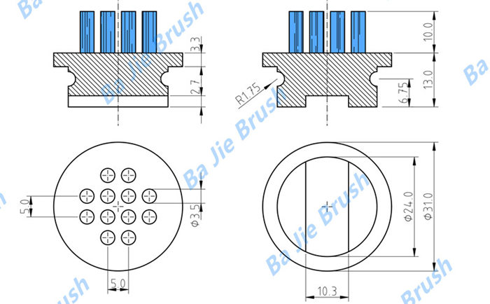 A 포탑 버튼 브러시또한 ~라고도 알려져 있습니다. 버튼 베드 브러시 또는 버튼 브러시 테이블 구성 요소이 제품은 터릿 펀치 프레스 기계용으로 제작된 원형 스테이플 세트 브러시입니다. 각 브러시는 다음과 같은 특징으로 만들어집니다. 둥근 플라스틱 받침대 그리고 부드러운 나일론 솔 펀칭 과정에서 판재를 부드럽게 지지하여 긁힘, 찌그러짐 또는 표면 손상을 방지합니다. 모양이 단추와 비슷하여 흔히 "버튼 브러시"라고 불립니다. 생산 과정에서 플라스틱 바탕에 여러 개의 구멍을 뚫고 촘촘한 나일론 털을 채워 넣어 내구성이 뛰어나고 오래가는 지지면을 만듭니다.